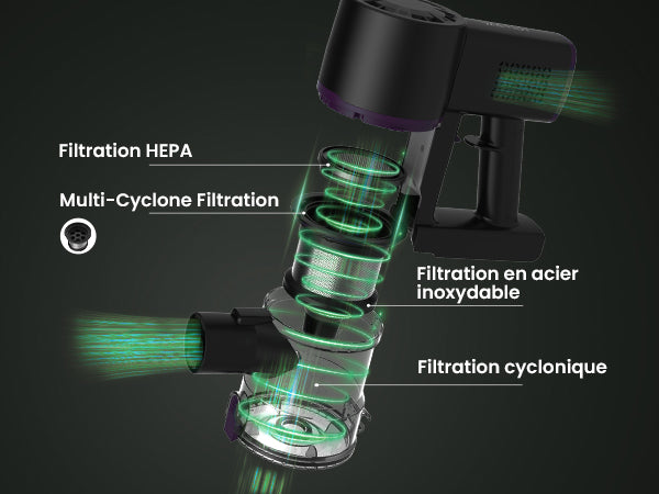 Le filtre HEPA, ainsi que l'ensemble du bac à poussière et les composants internes, sont amovibles et lavables.