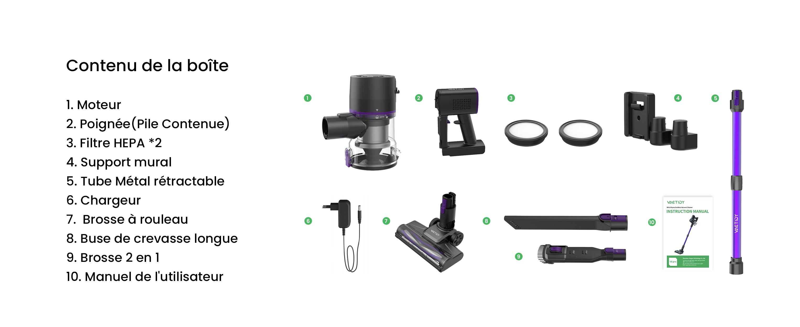 L'écran LED affiche en temps réel le niveau de charge de la batterie et la puissance d'aspiration, fournissant ainsi des informations sur l'état de fonctionnement.