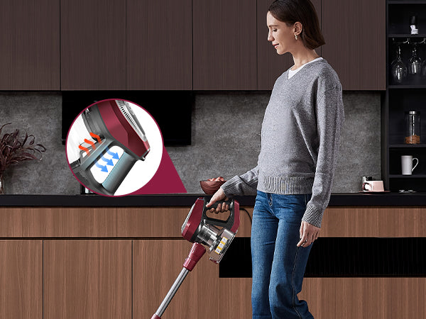 L'aspirateur filaire C8 est équipé d'un cordon d'alimentation extra-long de 7 mètres, vous permettant de nettoyer toute la pièce, du salon à la chambre, avec une seule source d'alimentation.