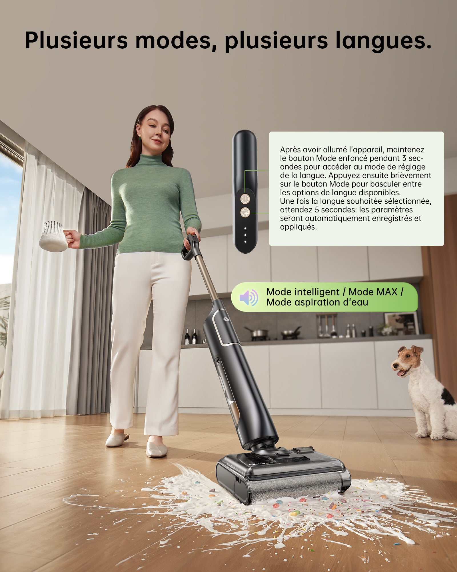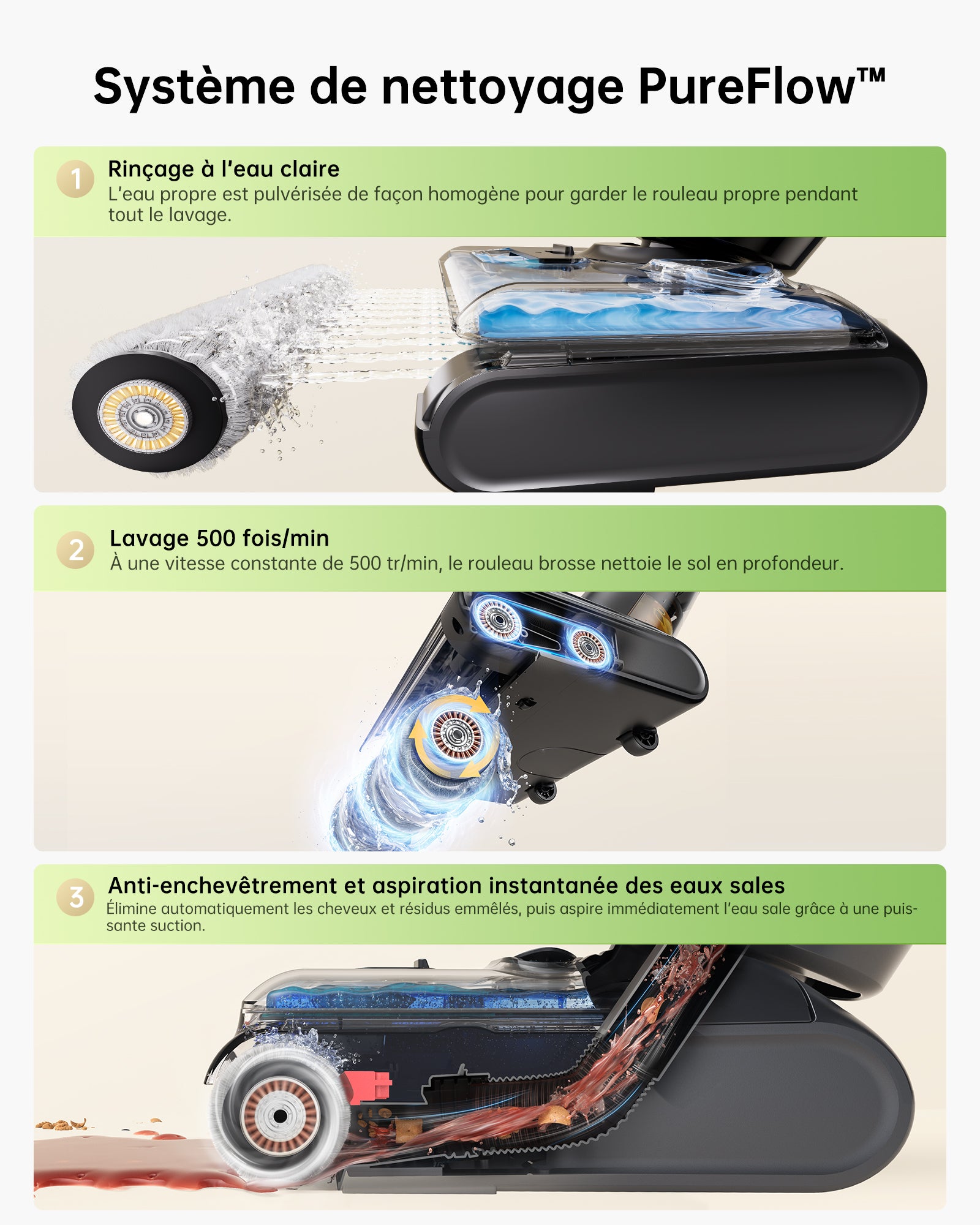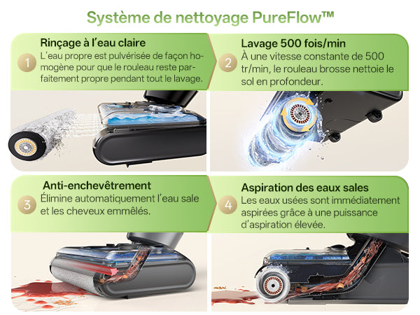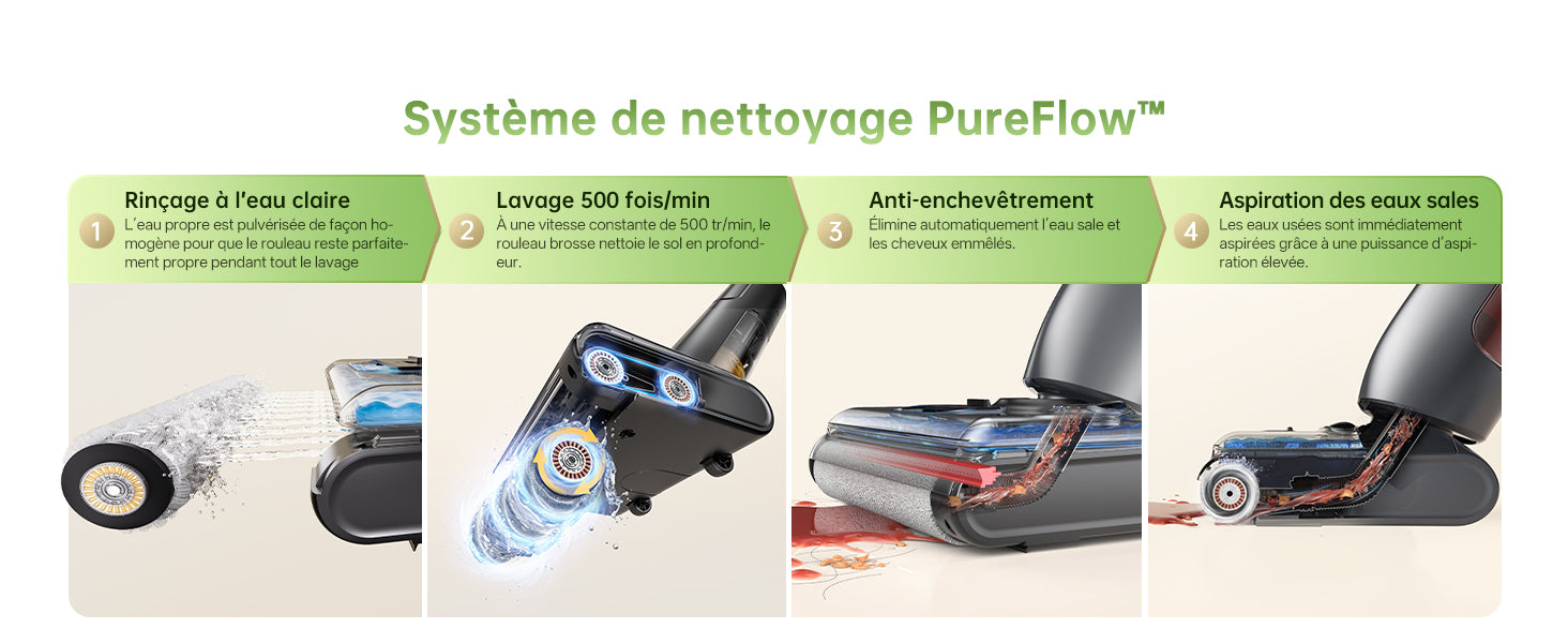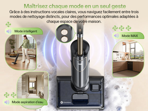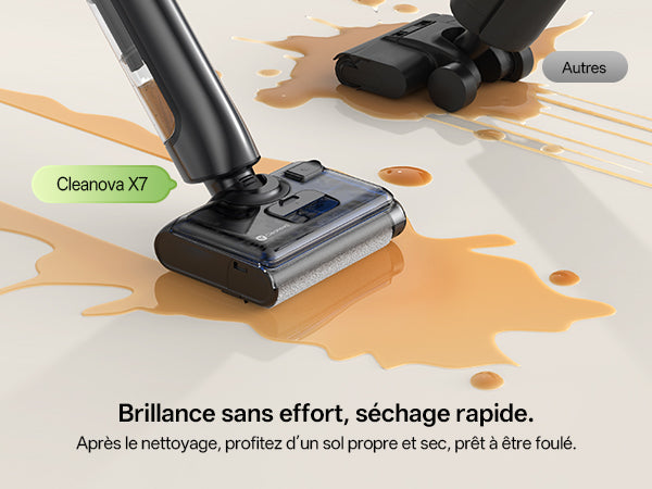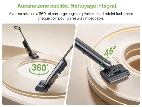 Conception autonome et aspiration rapide pour des sols secs en quelques minutes, sans traces.