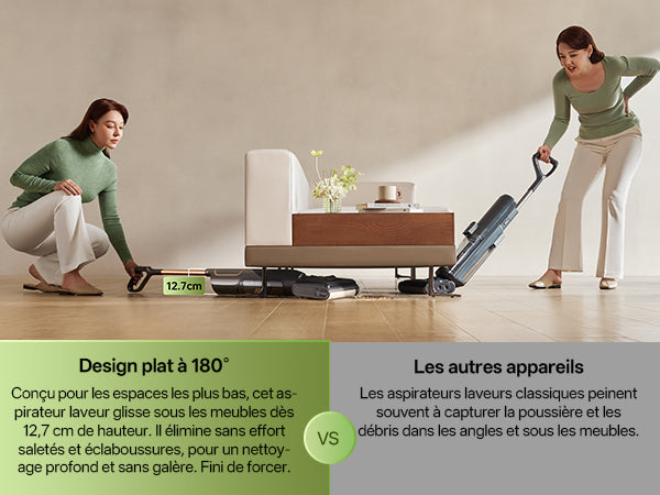 Nettoyage à plat à 180° pour atteindre sous les meubles. Passe dans les espaces serrés de 12,7 cm.
