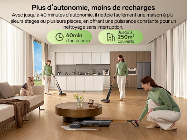 40 minutes d'autonomie pour nettoyer plusieurs pièces ou un étage entier.