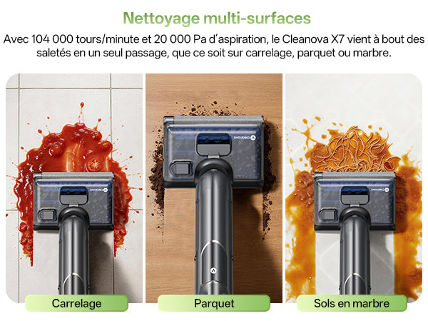 Aspiration de 20 000 Pa pour nettoyer les sols en carrelage, bois et marbre.