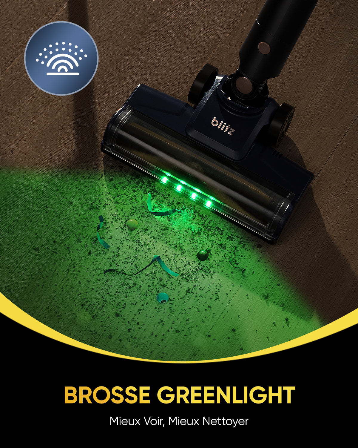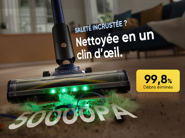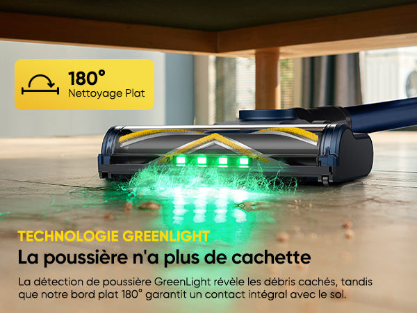 Le projecteur à lumière verte détecte les minuscules particules de poussière, et la tête de brosse à 180° atteint facilement tous les recoins.