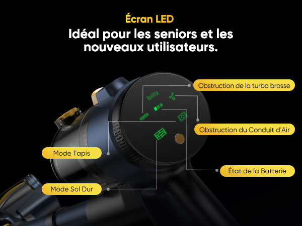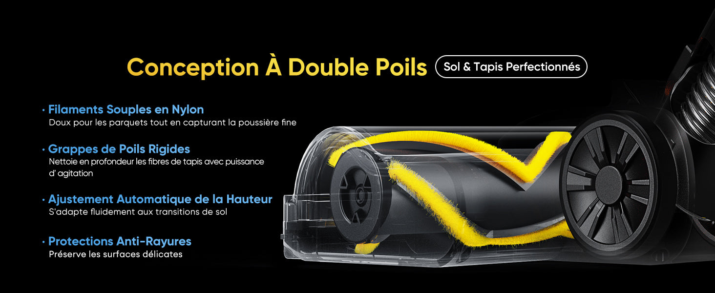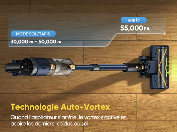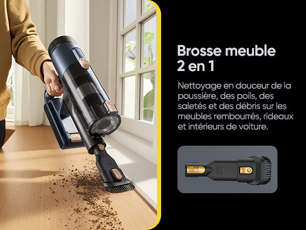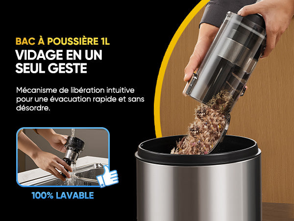 Le bac à poussière de grande capacité ne nécessite pas de nettoyage fréquent, et la fonction de vidage en un seul geste facilite le nettoyage.