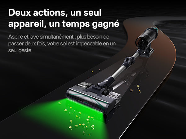 Plus besoin de choisir entre aspirer ou laver. L’aspiration et le lavage simultanés nettoient en profondeur sans effort.