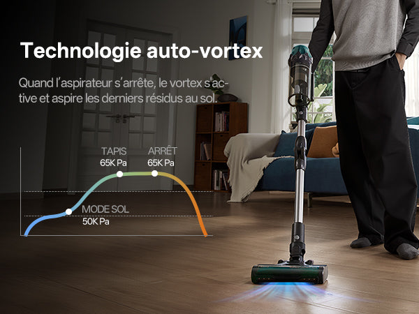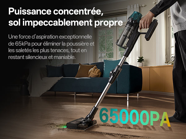 Une aspiration qui s'intensifie à 65 000 Pa à l'arrêt pour éliminer toute trace de poussière. Performances adaptatives (40 000 - 50 000 Pa) en mode sol/tapis.