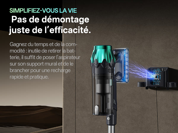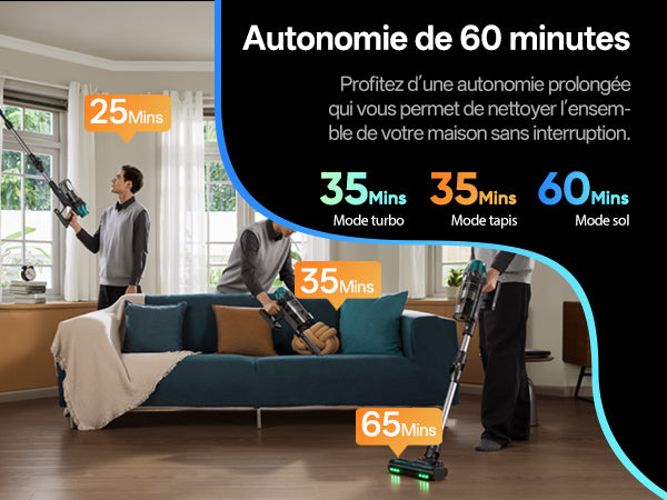 Nettoyez l'intégralité de votre domicile sans interruption. Adapté aux modes Tapis et Sols.