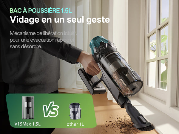 Capacité généreuse de 1.5L. Mécanisme de vidage intuitif pour une évacuation rapide, propre et sans désordre.