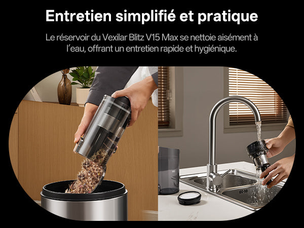 Le réservoir se nettoie facilement à l'eau, garantissant une hygiène parfaite et une performance optimale durable de l'aspirateur.