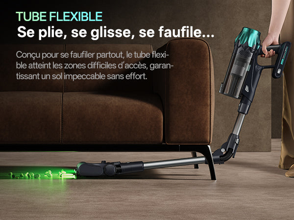 Un tube qui se plie et se glisse pour nettoyer derrière et sous les meubles, garantissant un sol impeccable sans efforts.