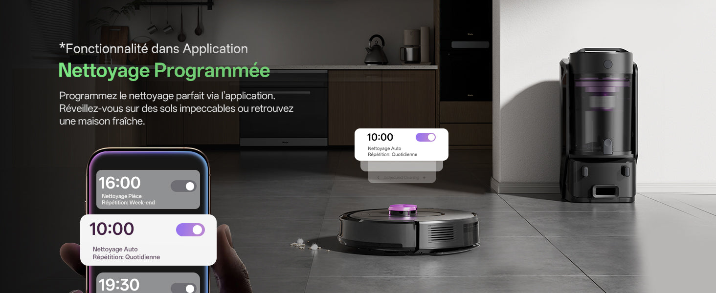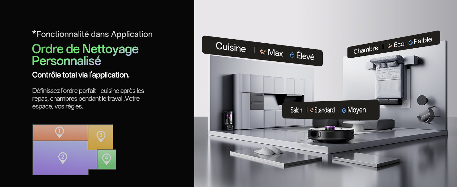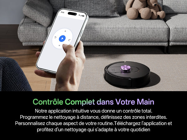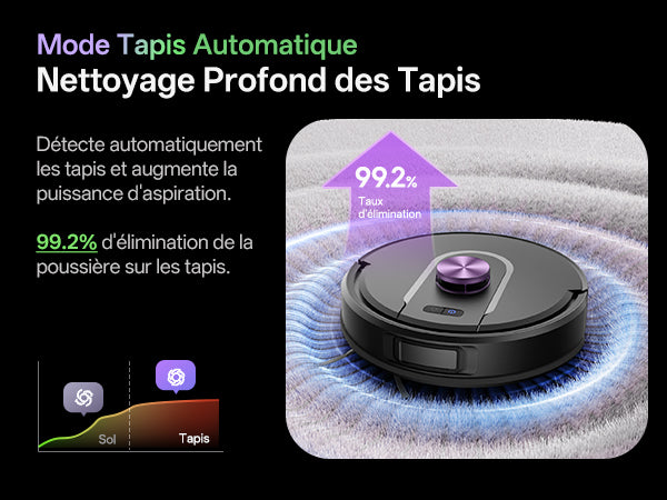 Détecte automatiquement les tapis et augmente la puissance pour un nettoyage profond. Élimine 99,2 % de la poussière avec une efficacité certifiée.
