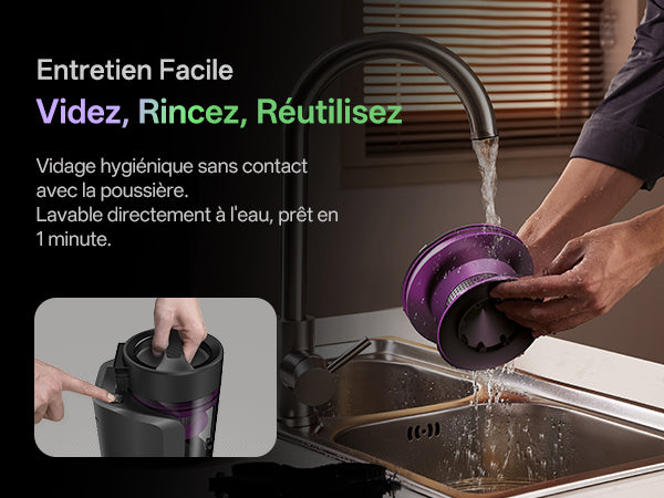 Vidage sans contact et lavage à l'eau. L'entretien complet ne prend qu'une minute, pour une hygiène impeccable.