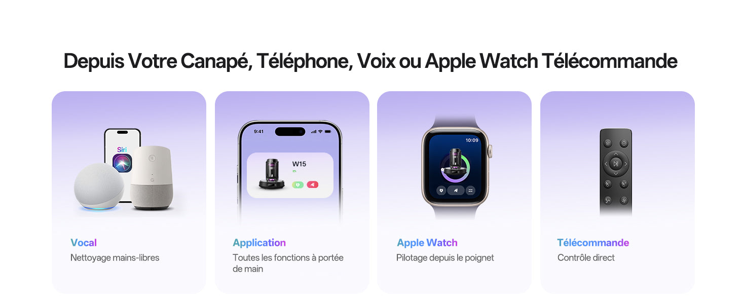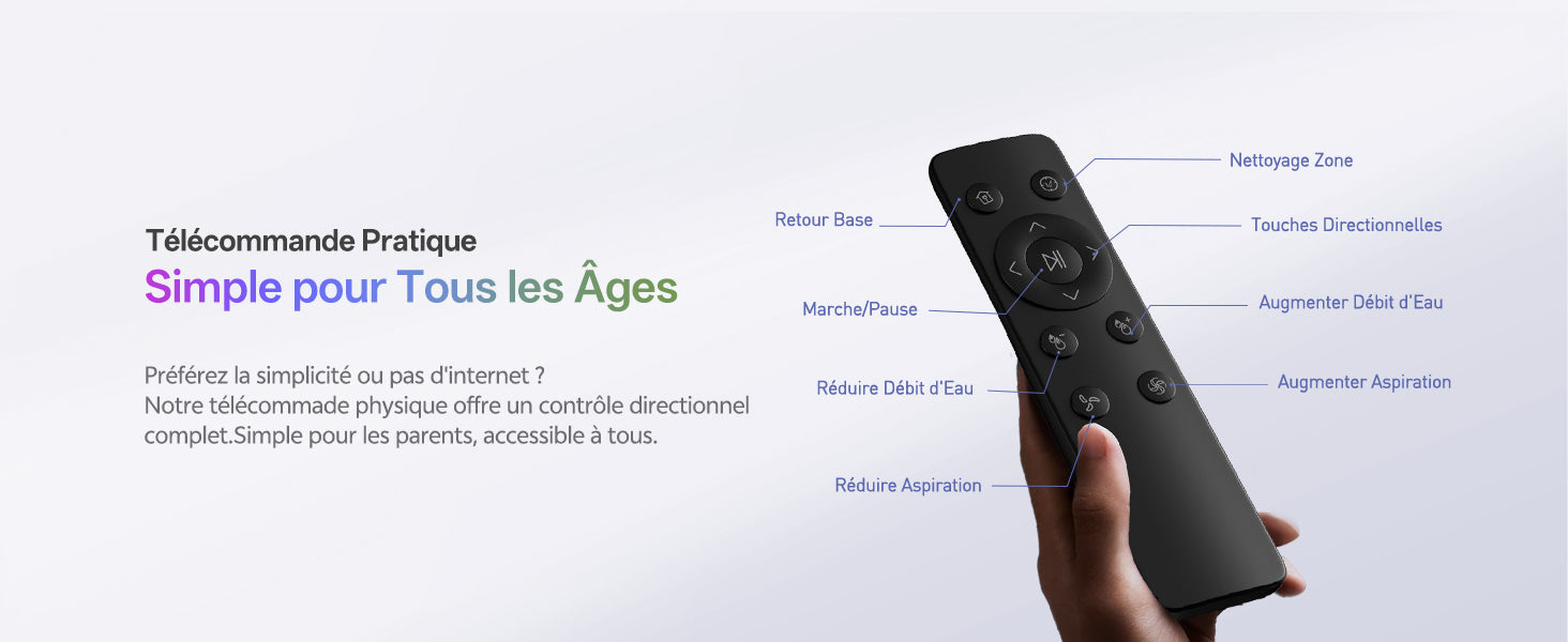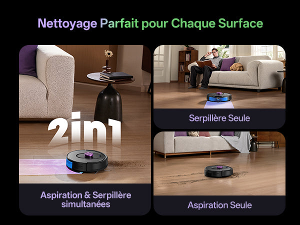 Aspiration et serpillère simultanées, aspiration seule pour tapis, ou serpillère seule. Adapté à toutes les surfaces.